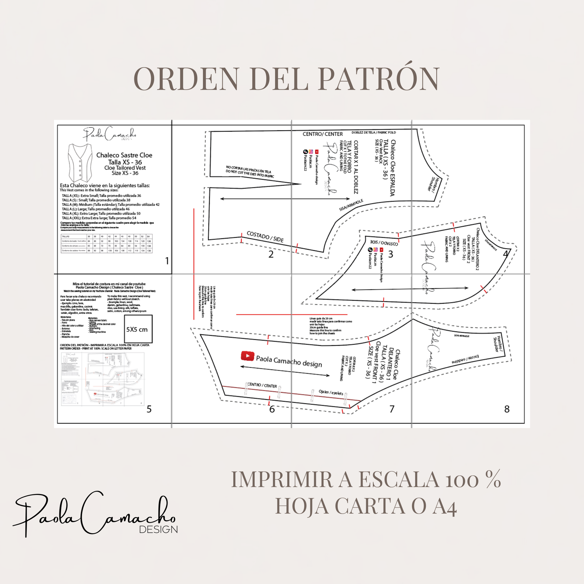 Le invitamos a ver el video con todo el proceso de costura. El patrón de chaleco incluye archivos en las tallas solicitadas: archivo pdf de patrón Chaleco sastre , las hojas deben ser ordenadas según el número que muestre la hoja para unir las piezas.