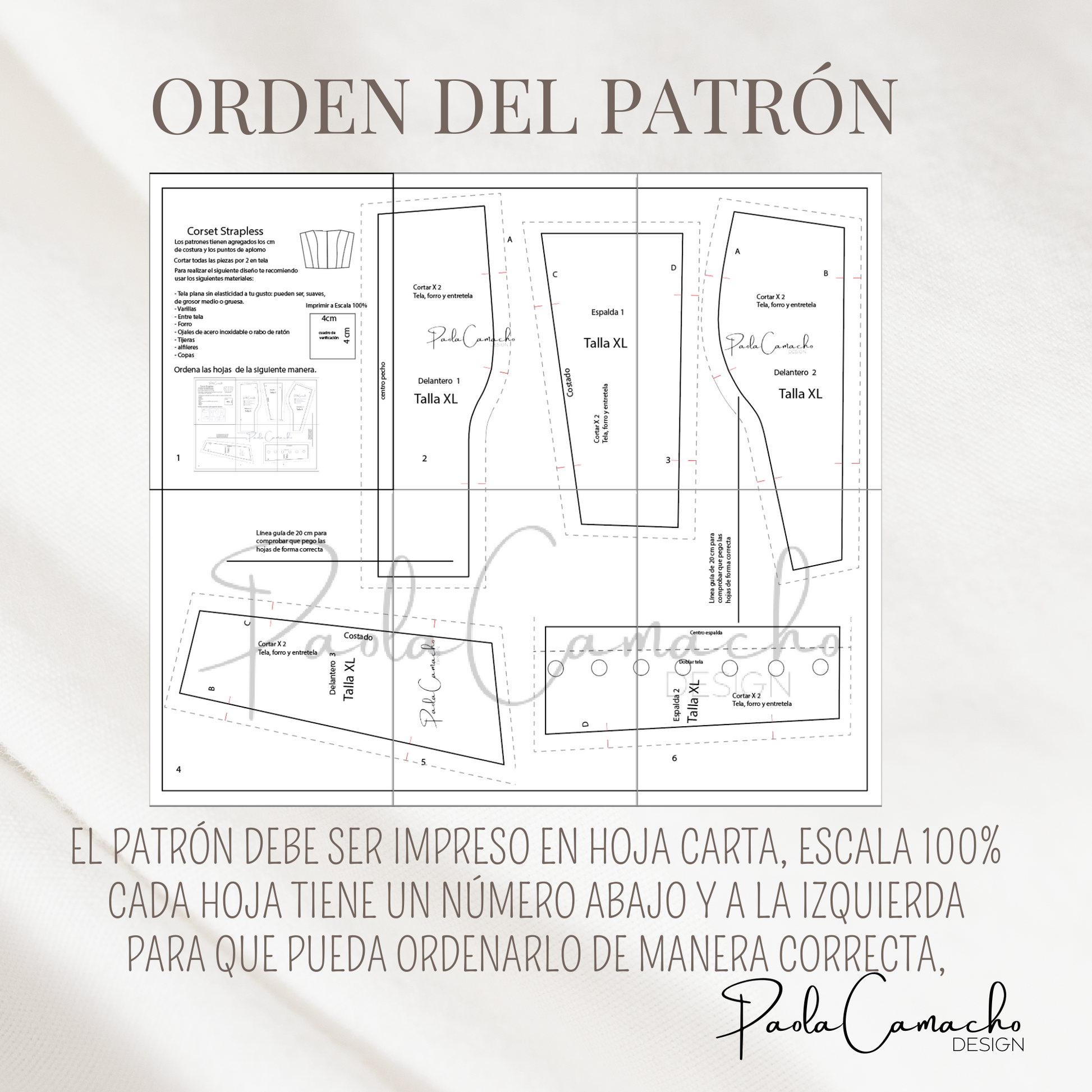 We invite you to watch the video with the entire sewing process. The corset pattern includes corset files in sizes S, M, L and XL: corset pattern pdf file, the sheets must be ordered according to the number shown on the sheet to join the pieces.